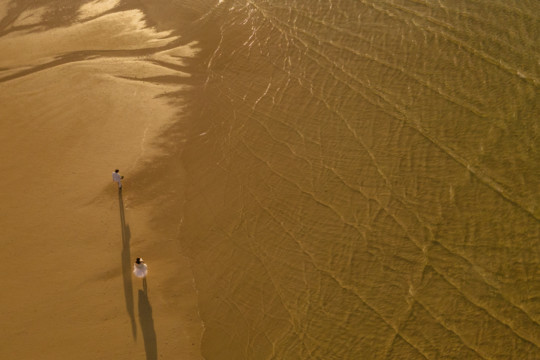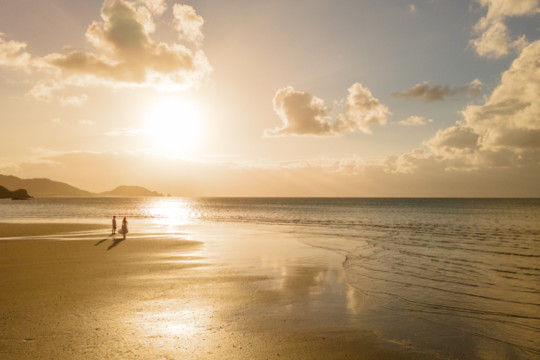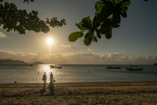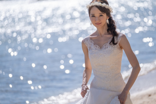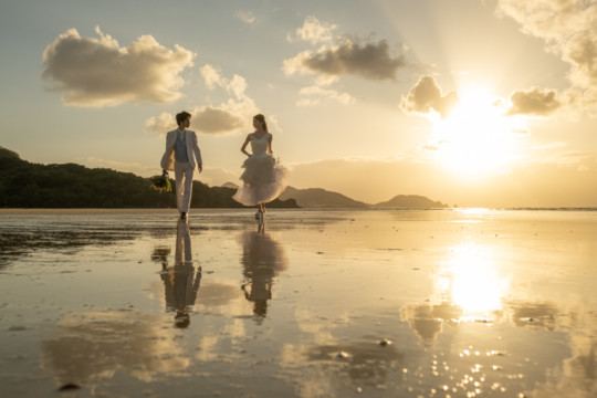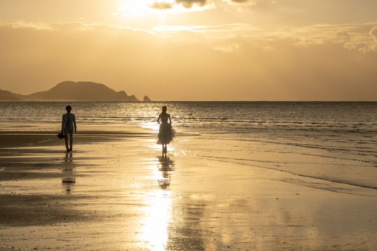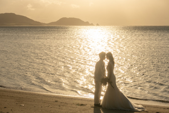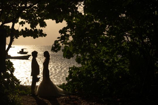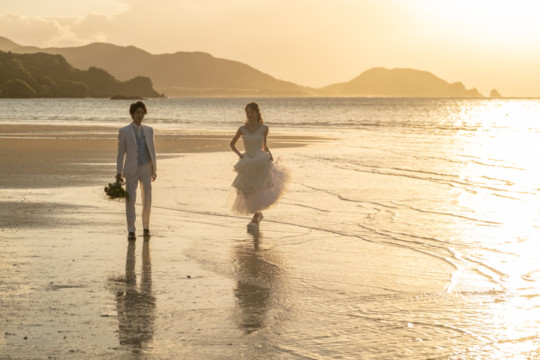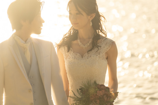 遠くにできた台風の影響もあり、風が強い中でのフォトウェディング撮影。いくつもの雲の重なりが光を屈折させ、最高のサンセットを演出してくれました。