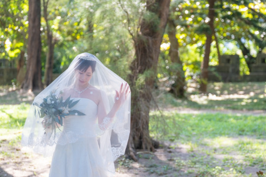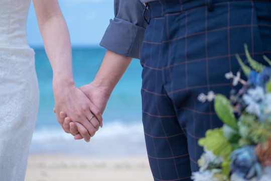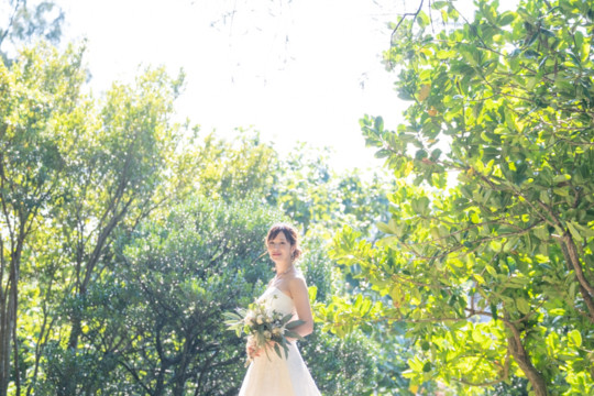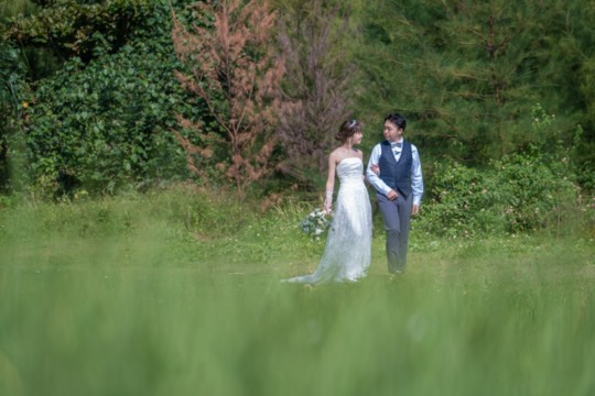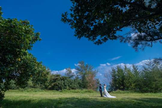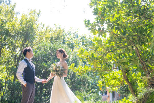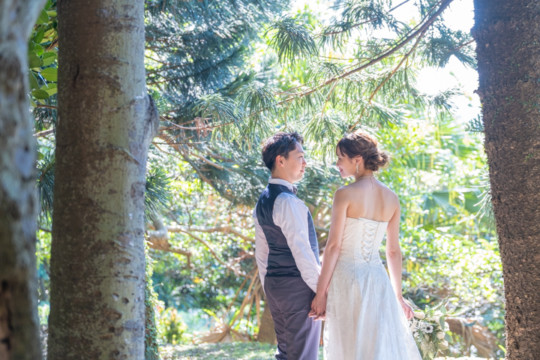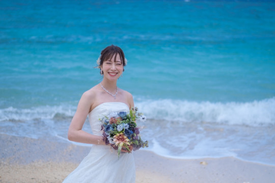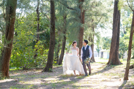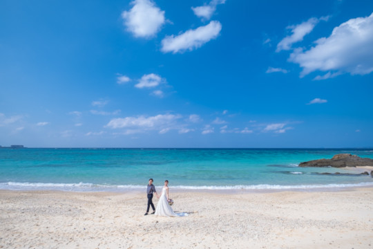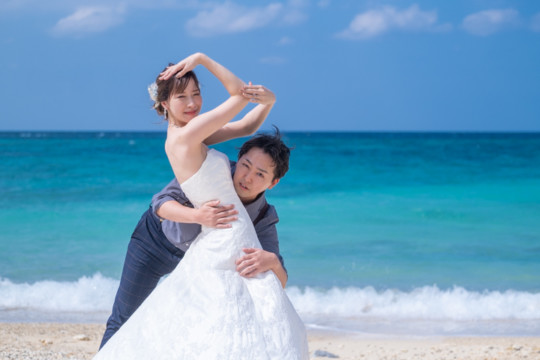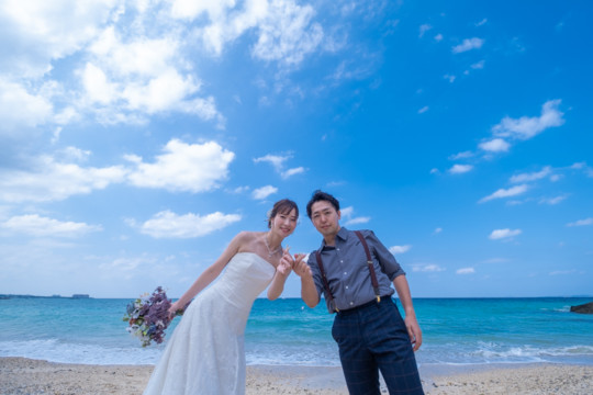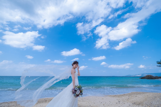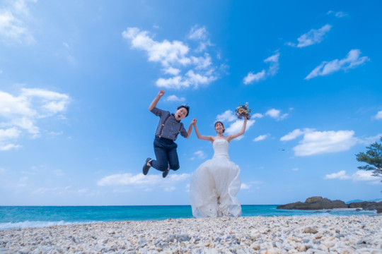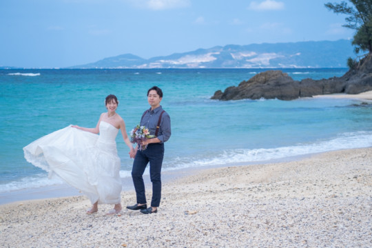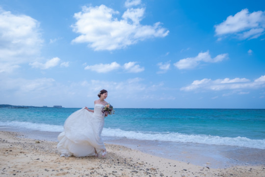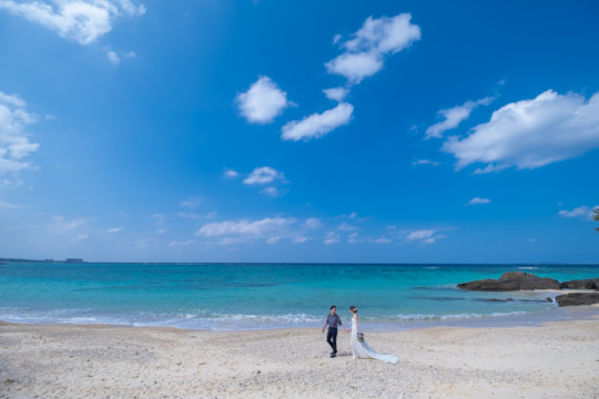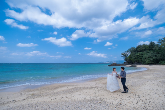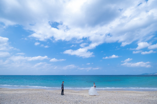 太陽を覆っていた大きな雨雲は、いつの間にか薄くなり、おふたりが撮影を始めたころには見事な青空が広がっていました。もう10月の末だというのに、汗ばむほどのフォトウェディング日和。綺麗なビーチでの撮影を行うことができて、おふたりにも喜んでいただけました。