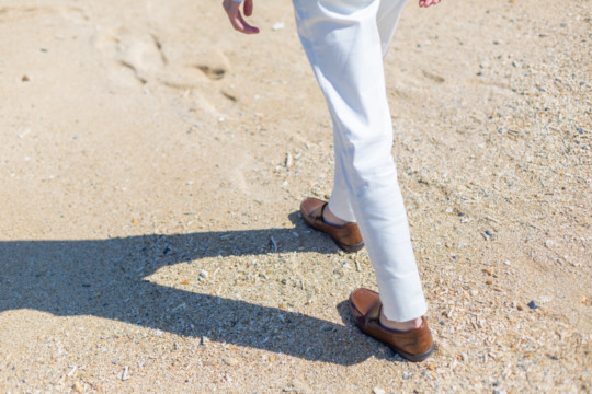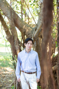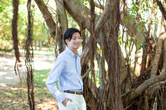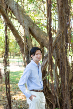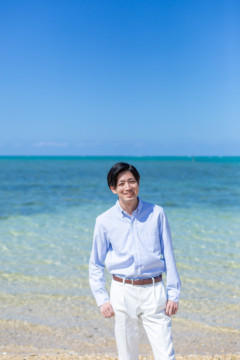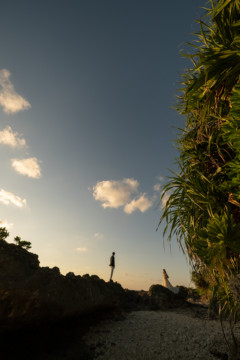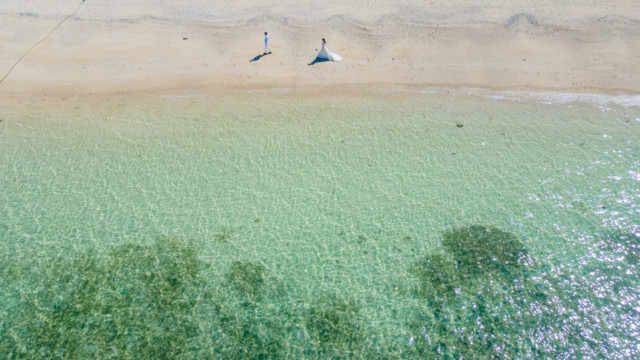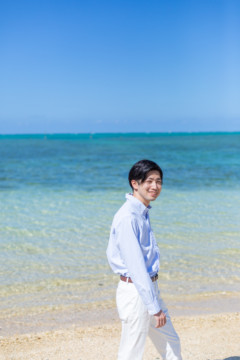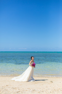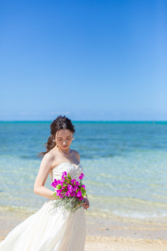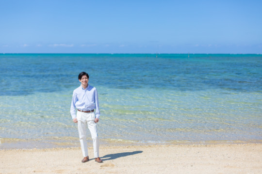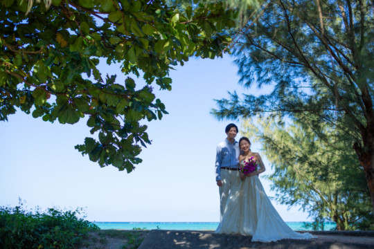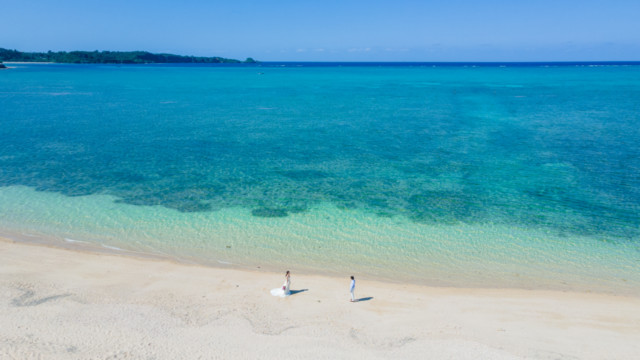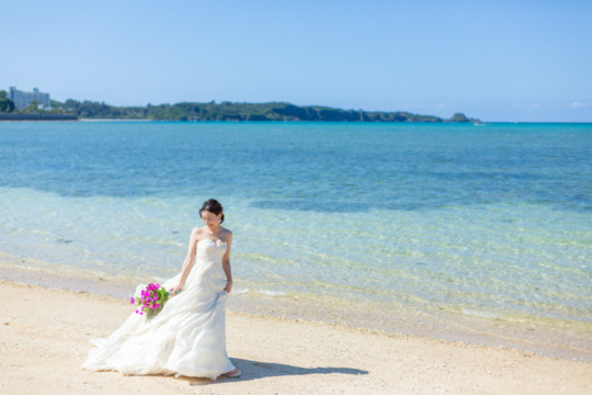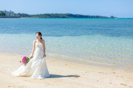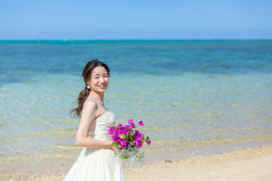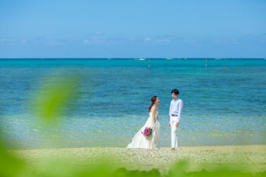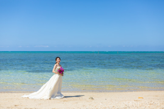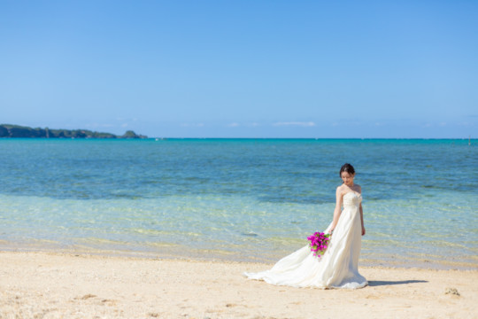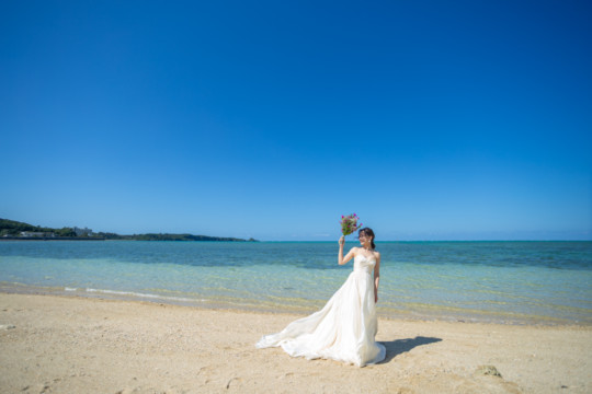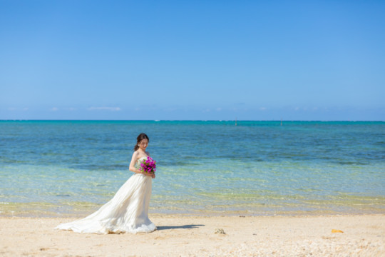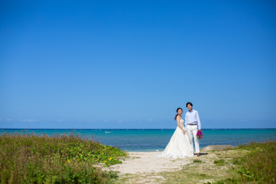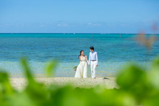 ヘアメイクを済ませ、まず最初に向かったのは、地元民に愛される憩いのビーチ「仲泊海岸」。植物もあるので、青い海に植物の緑も一緒に撮影できるおすすめの撮影地のひとつです。