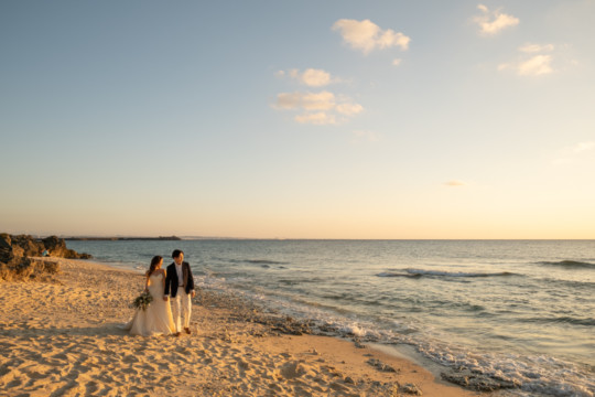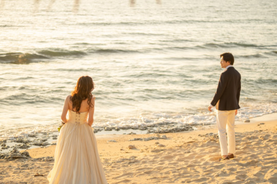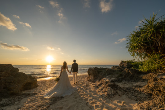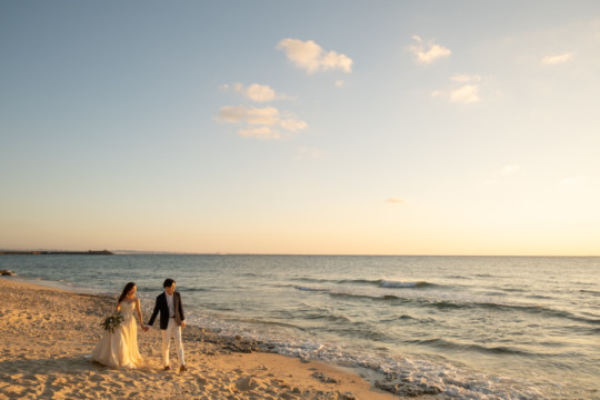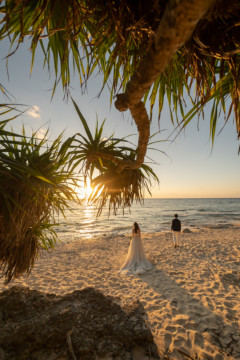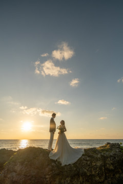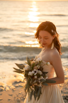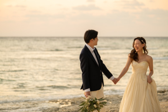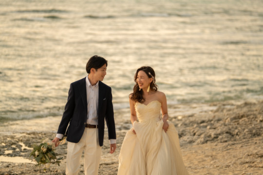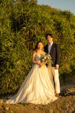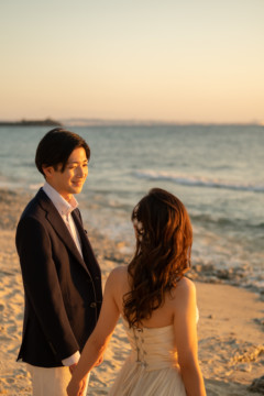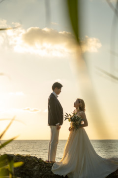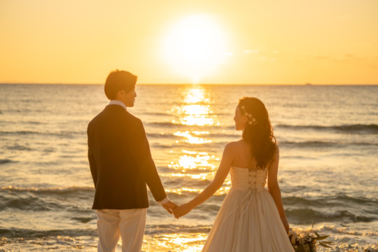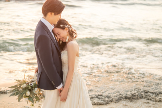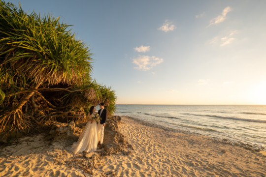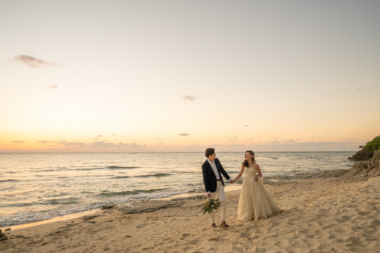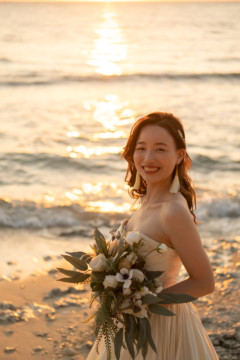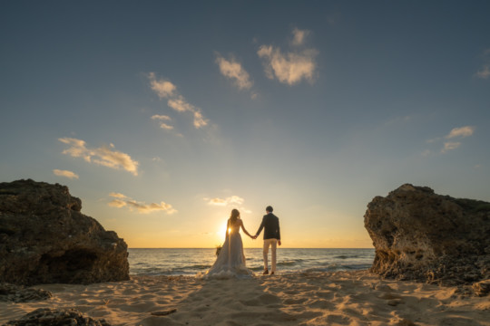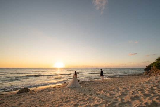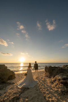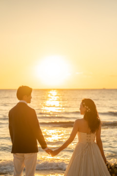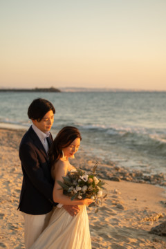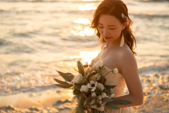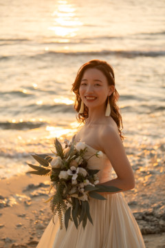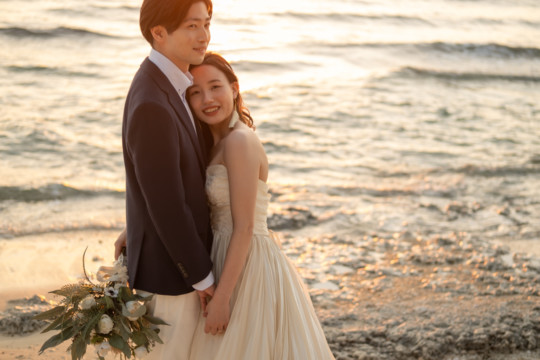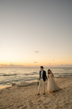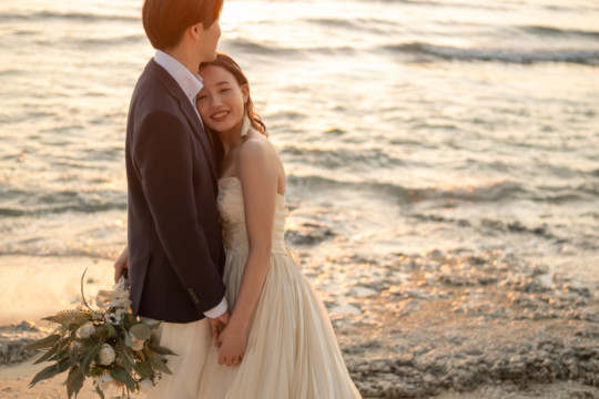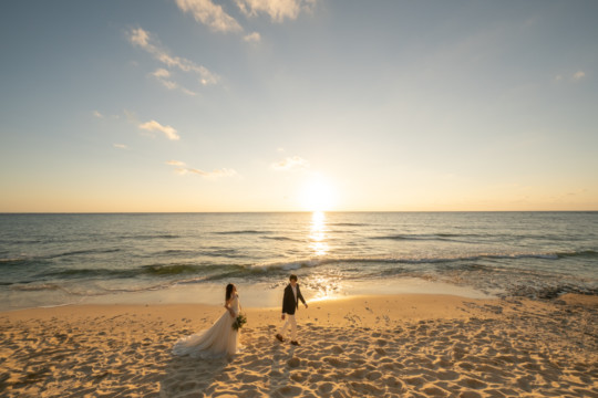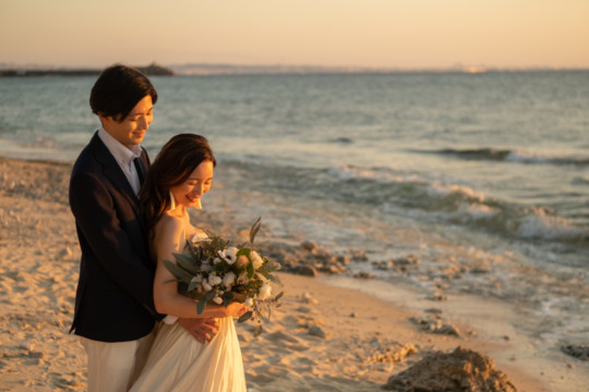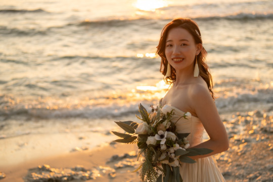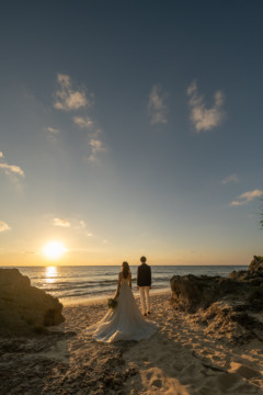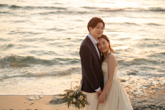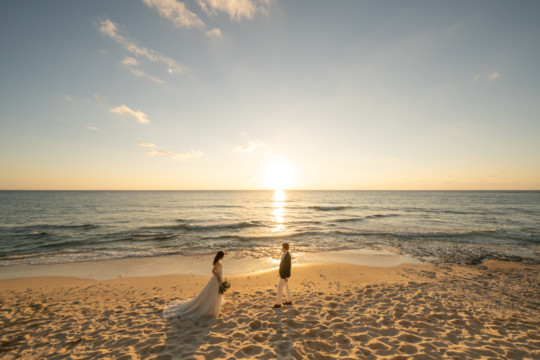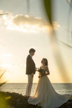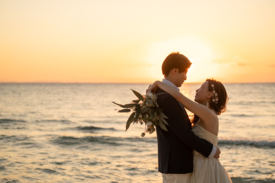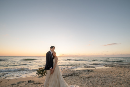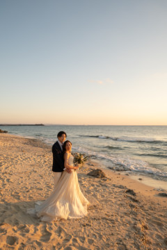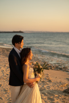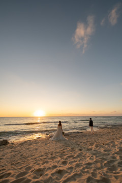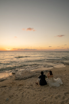 誰も来ないであろうサンセットの秘密のビーチ。徐々に沈みゆく太陽が、フォトウェディングの終わりを知らせ、どこか寂しい気持ちになると同時に、心地よい疲労感。この日も全力を出し切りました。