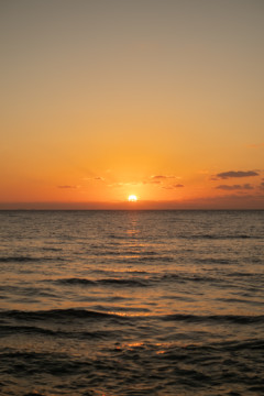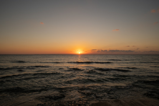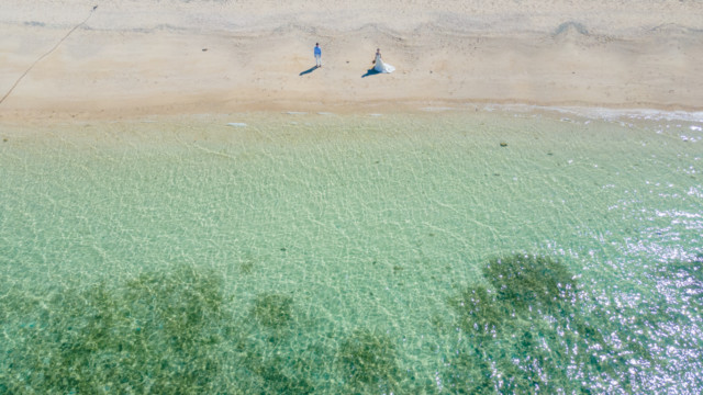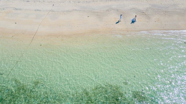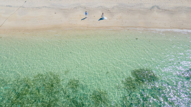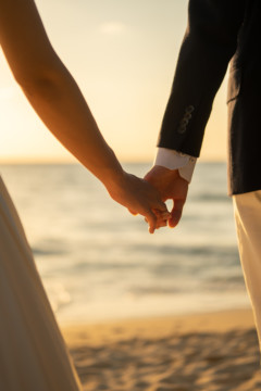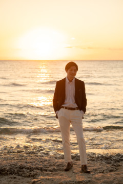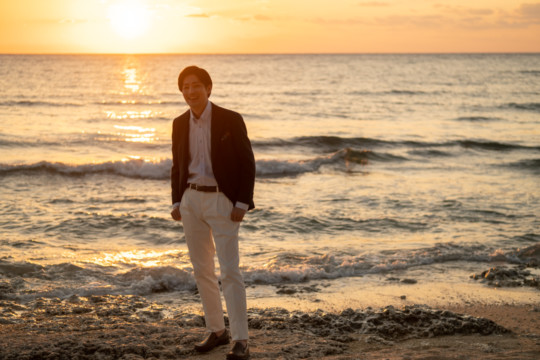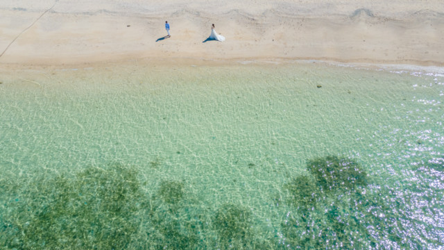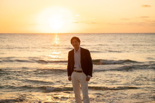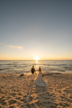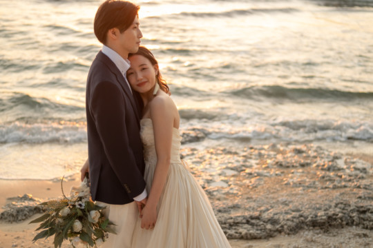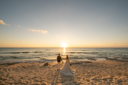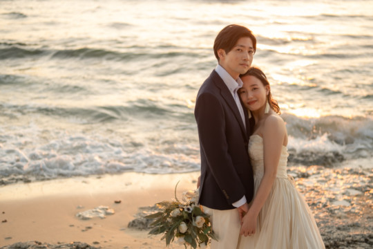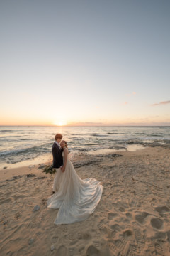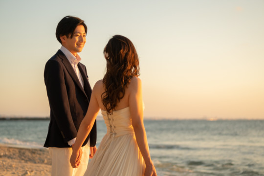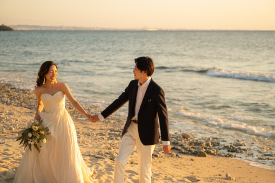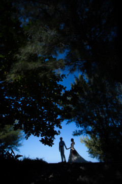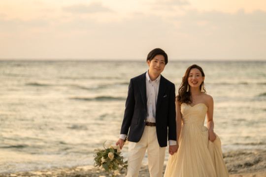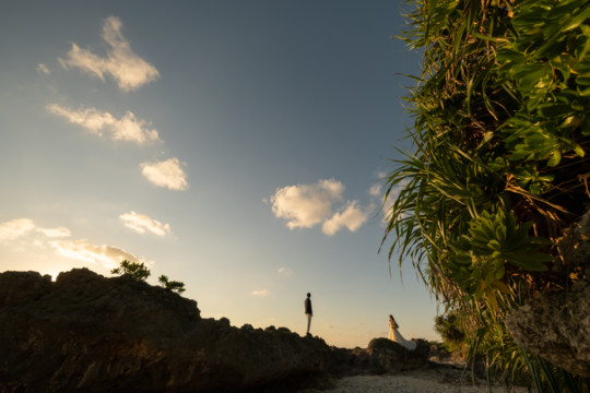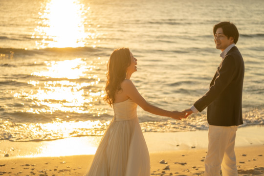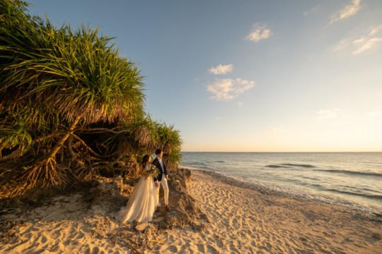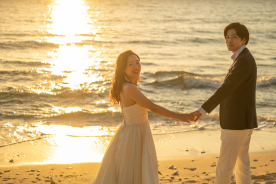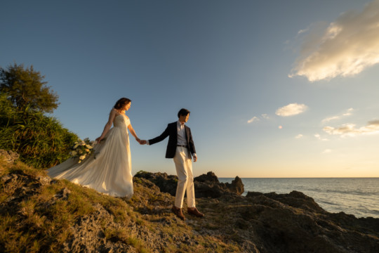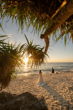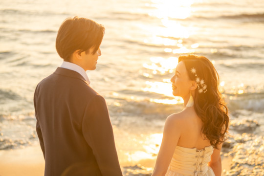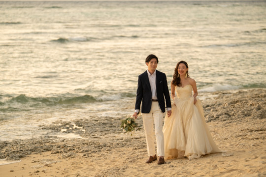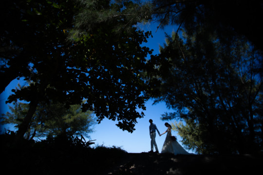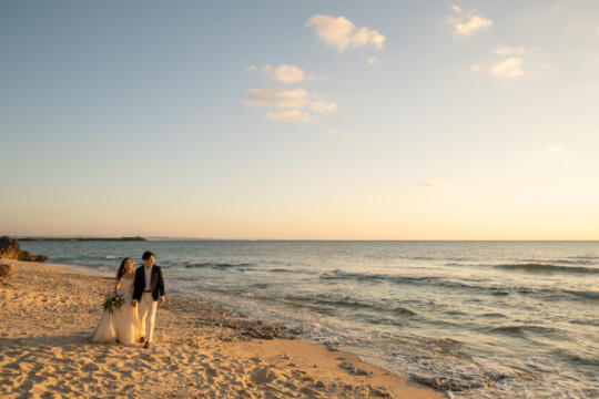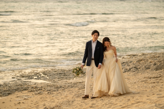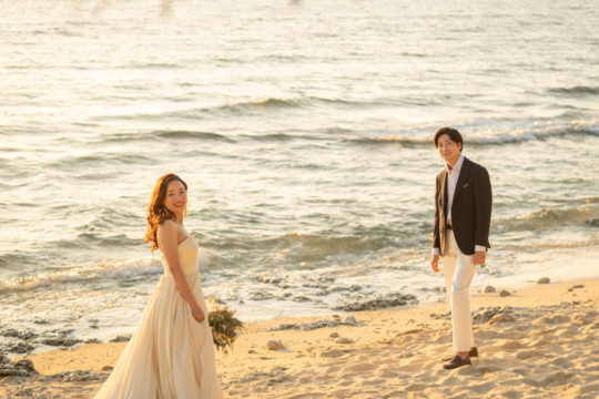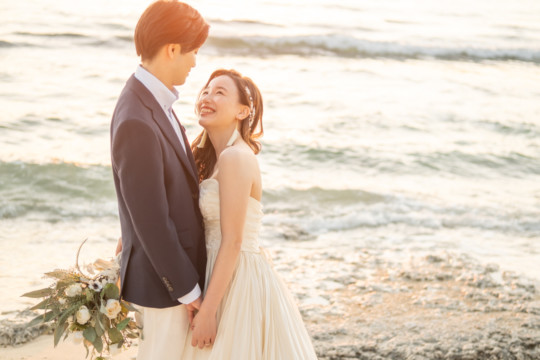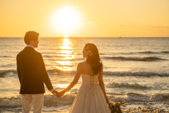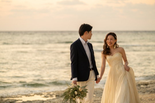 誰も来ないであろうサンセットの秘密のビーチ。徐々に沈みゆく太陽が、フォトウェディングの終わりを知らせ、どこか寂しい気持ちになると同時に、心地よい疲労感。この日も全力を出し切りました。