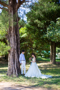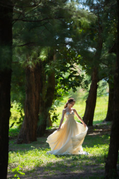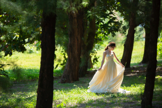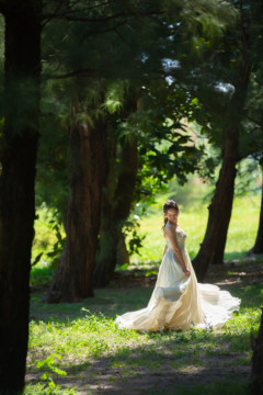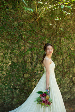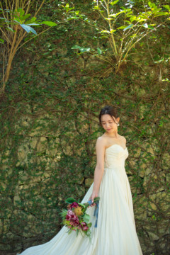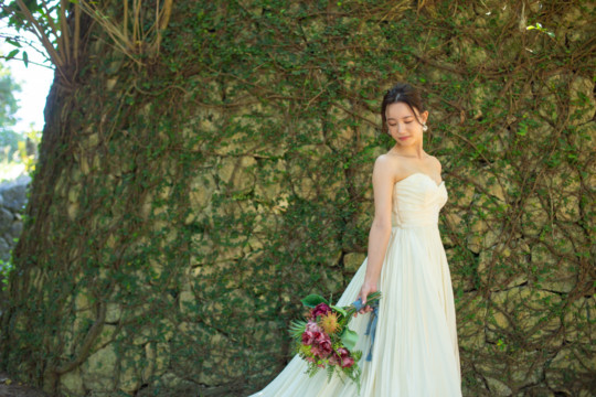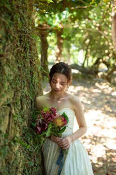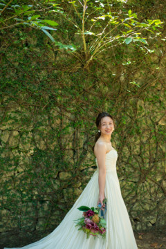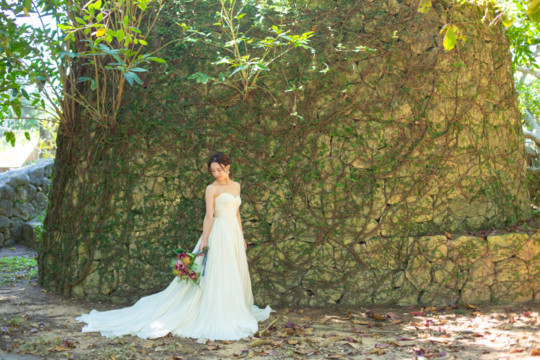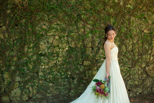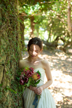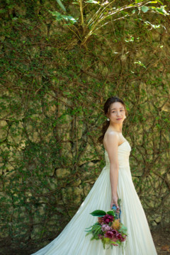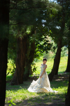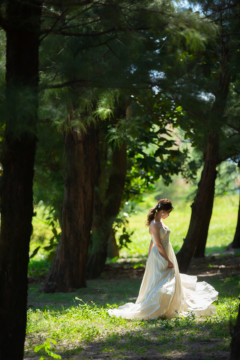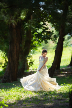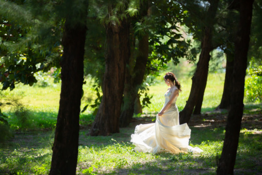 建造物だけではなく、木々もあるのでご安心ください。木々の隙間から差し込む光にドレスが光りとっても綺麗な写真を撮影することができました。シルクの光沢生地が柔らかく輝いて見え、とっても素敵な瞬間でした。