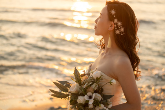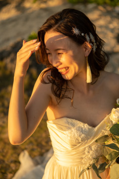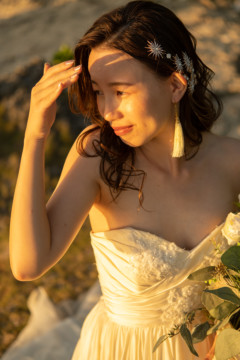 無事、日柱のフォトウェディングを終え、しばし休憩。夕方にはサンセットで再度フォトウェディング開始。髪の毛をダウンスタイルにチェンジし、お持ち込みいただいたイヤリングも少し大ぶりなものに変えました。