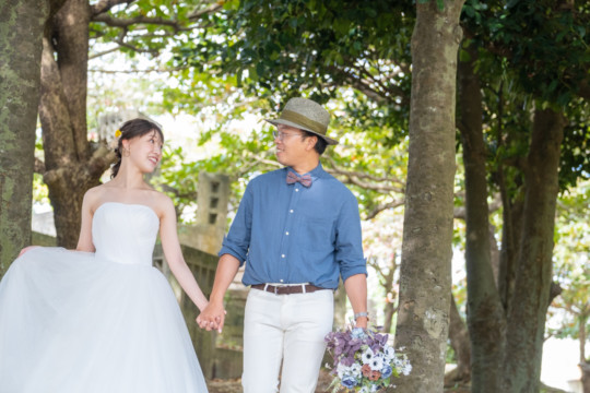 ここの魅力はなんと言っても不思議な建築物と生命力溢れる木々の織りなす神秘的な雰囲気です。フォトウェディングでは明るく、爽やかな撮影地が多いのですが、「石川公園」のように薄暗い場所でしっとりした雰囲気のある撮影地でのフォトウェディング撮影もとてもおすすめです。