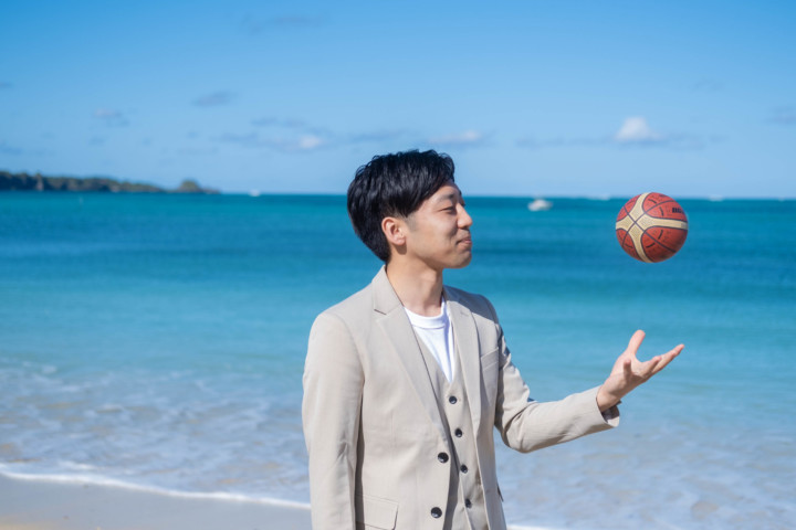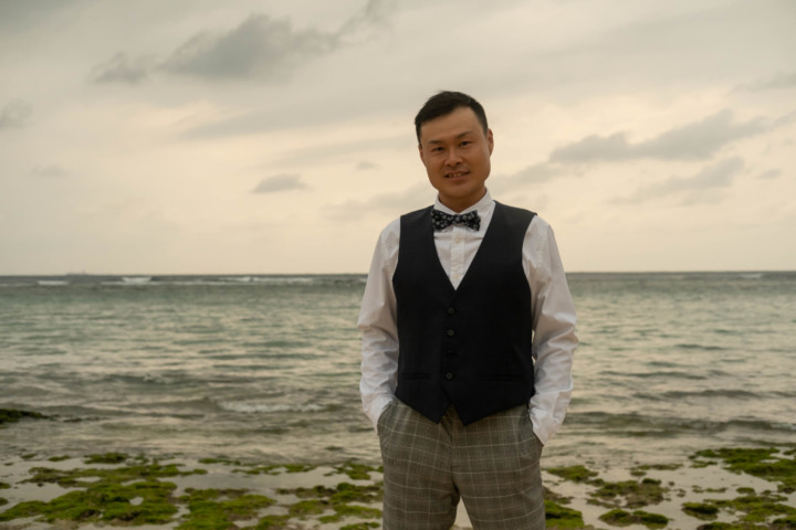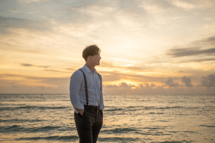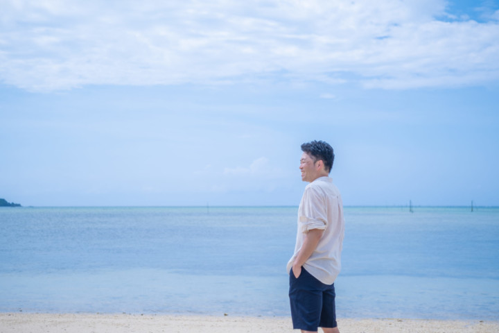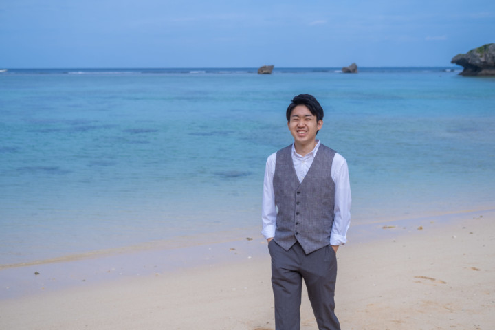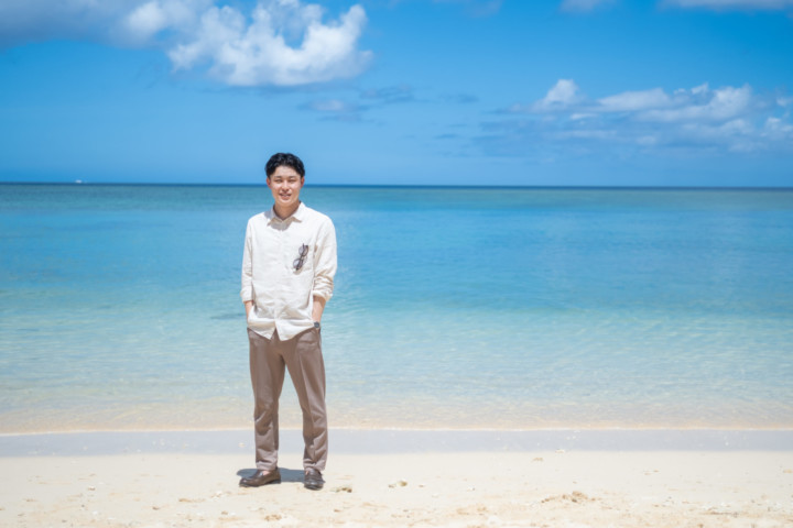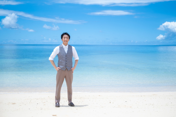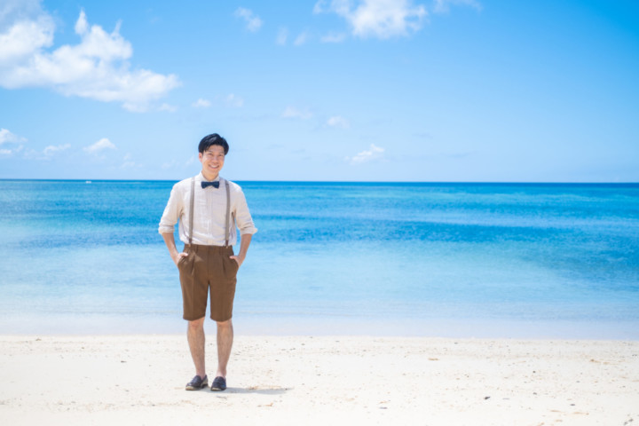 暑い沖縄のビーチで、ジャケットスタイルの撮影は大変です。しかし、ベストであれば比較的涼しくカジュアル衣装の中でもかっちりとしたフォーマル感を残し、スタイリッシュな印象を与えることができます。