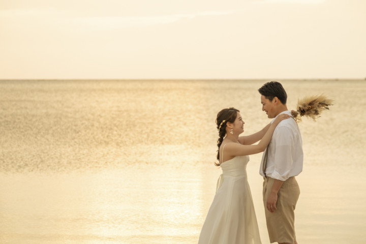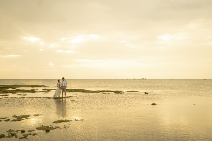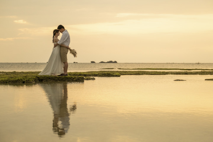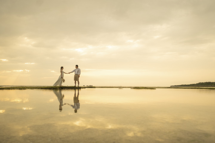 今回のウェディングフォトは日中の撮影フォトウェディングSプランにオプションとしてサンセット撮影も追加して頂きました♪サンセット撮影ではちょうど干潮の時間帯だった為、見事なウユニ塩湖風の撮影に成功!鏡の世界にいるようなお写真。とても素敵です。
