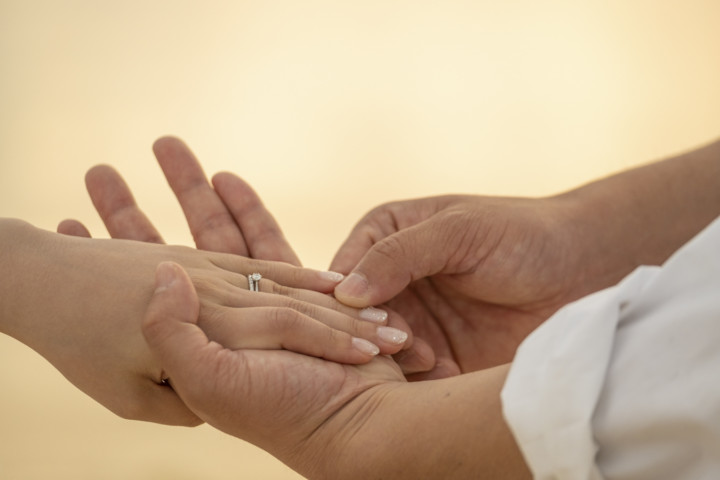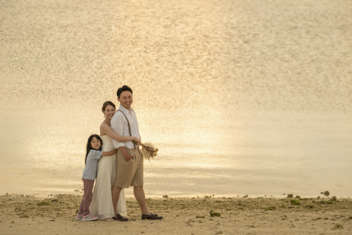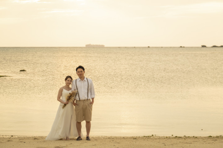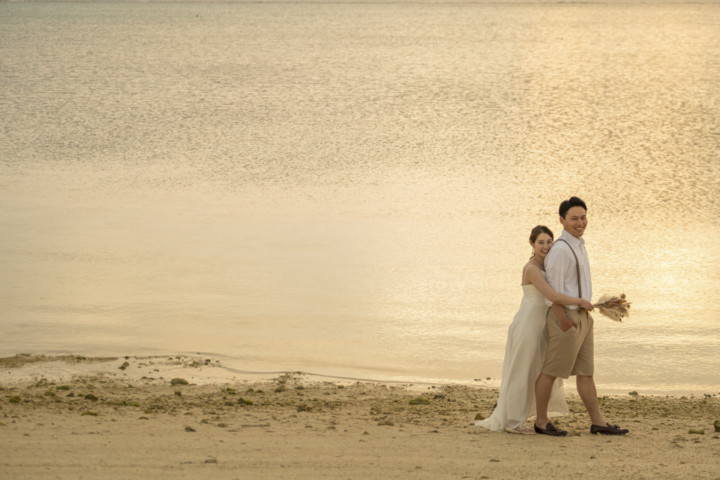 青い空と青い海、そしてオレンジ色のサンセット撮影までみっちりフォトウェディングをお楽しみいただいたおふたり。最後まで笑顔でお過ごしいただきましてありがとうございました。サンセットのラストカット(手元の写真)で雨が降り出して、ロケ車まで走ったことも忘れられない思い出です。こうしてお客様との思い出が増えることがとっても嬉しいことの一つです。