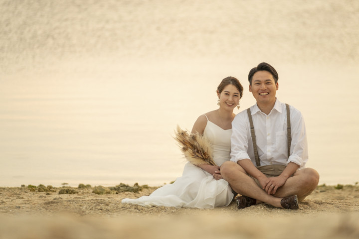 砂浜に座りながら寄り添って♪みんなでお話をしながらサンセットの時間をのんびり過ごしています。黄金色に輝くサンセットタイムでのウェディングフォトは特別感溢れる人気の撮影オプションとなっています♪日中とは雰囲気を変えてガラッとおしゃれに撮影してみませんか♪