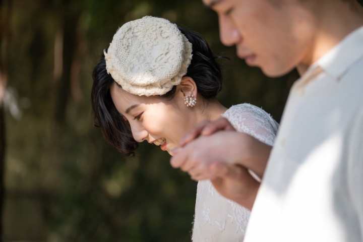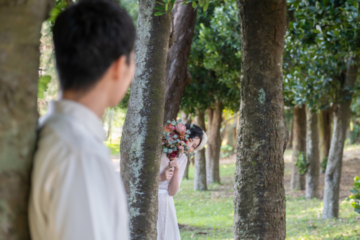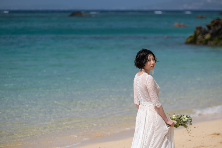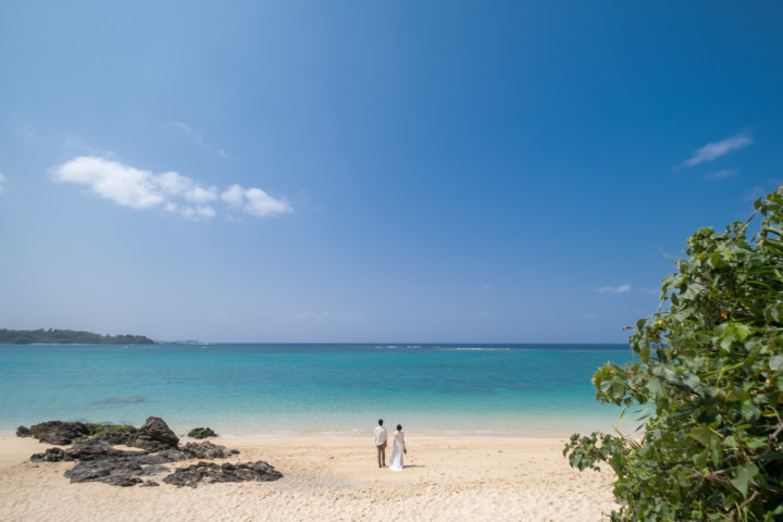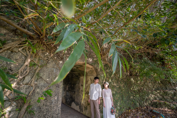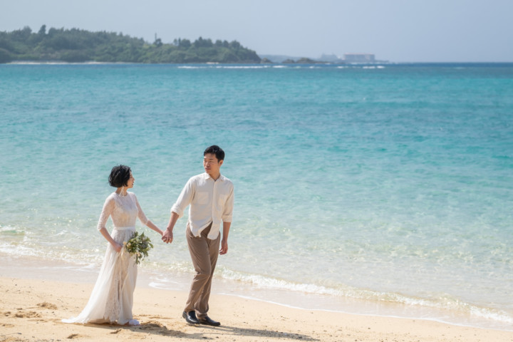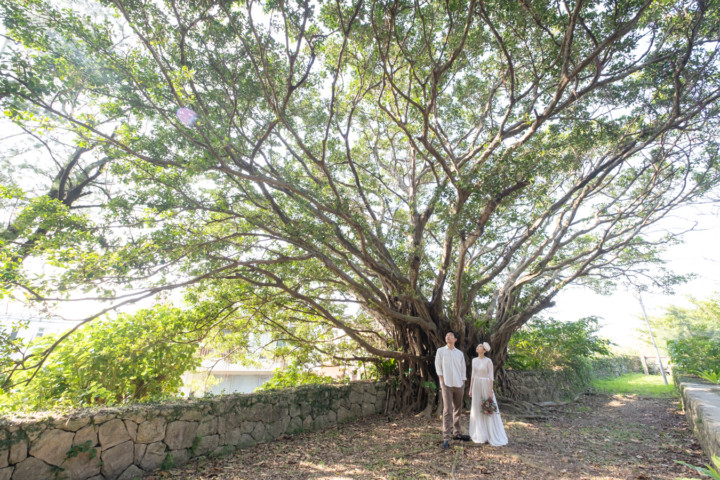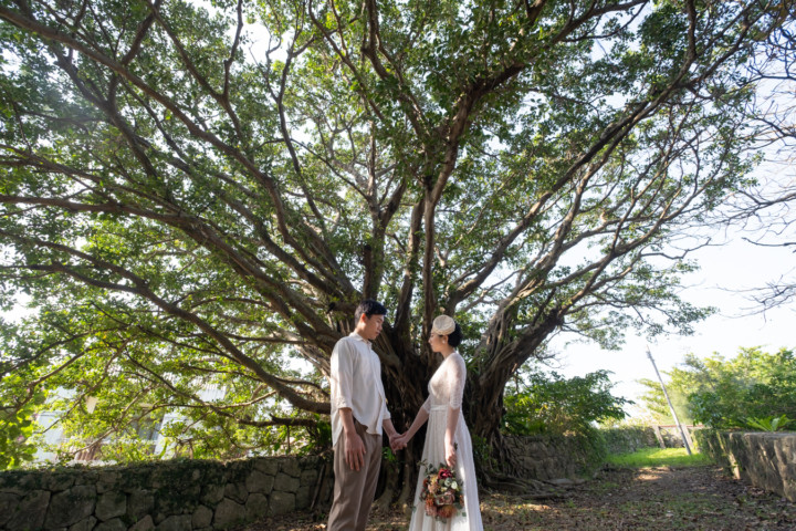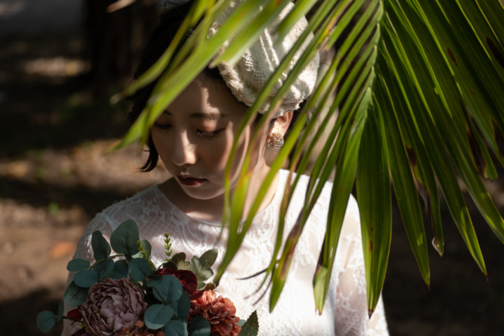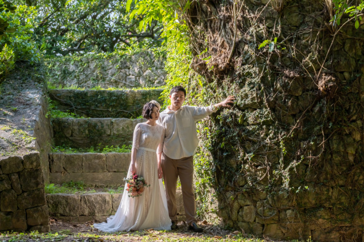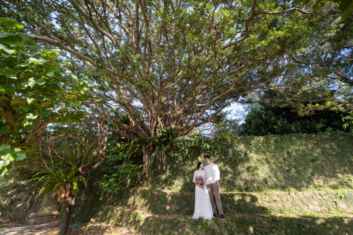 まるでグリーンに縁取られたような綺麗なお写真。お二人も見つめ合い、とても良い表情をしていますね♪今回のフォトウェディングMプランでは、お二人の好きな撮影地を2箇所お選び頂けるプランとなっております♪今回はビーチ(希望ヶ丘ビーチ)とグリーン(石川公園)での撮影。場所で雰囲気を変えて、沖縄でのフォトウェディングを楽しみませんか?