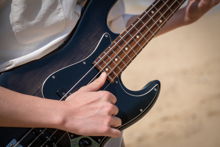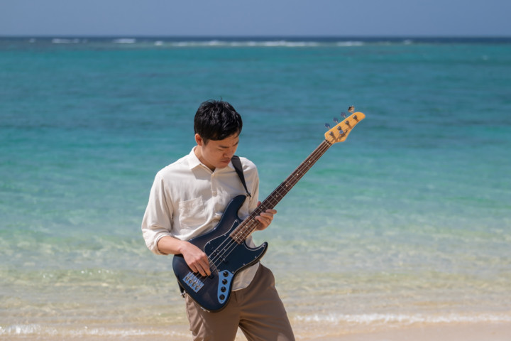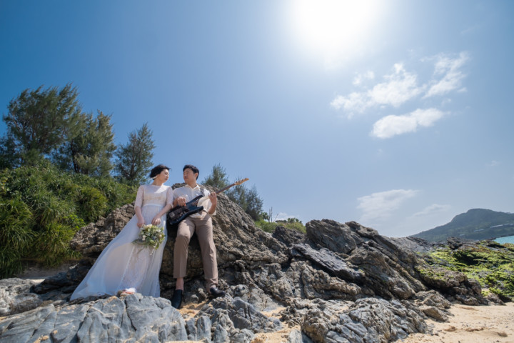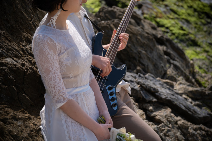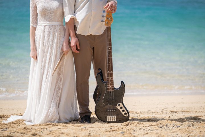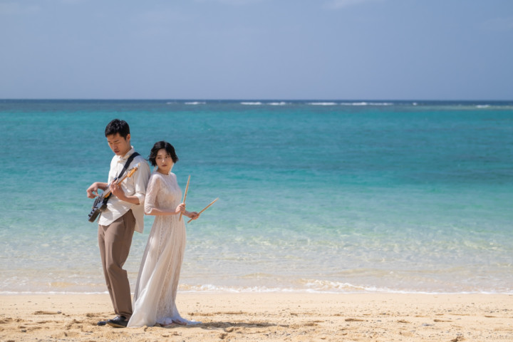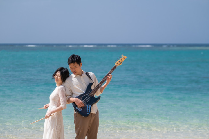 共通の趣味をきっかけに出会ったお二人。いつも使ってるギターとドラムスティックをお持ち込み頂きました!青い海をバックに、贅沢な撮影です。お持ち込み料金は一切かかりません♪