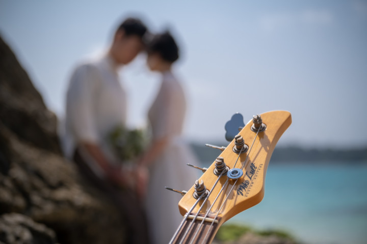 ギターを弾く姿、スティックを持つ新婦様、それぞれとても格好良かったです!今度は生演奏を是非!聞かせて下さいね。笑 とてもオシャレなお二人。お持ち込み頂いたグッズも凄く素敵でした。撮影当日は天気も良くて綺麗なビーチにご案内が出来て良かったです♪また沖縄に来た時には、是非ouchiに寄って遊びに来て下さい。いつでもお待ちしております♪この度は撮影ご依頼頂きありがとうございました。