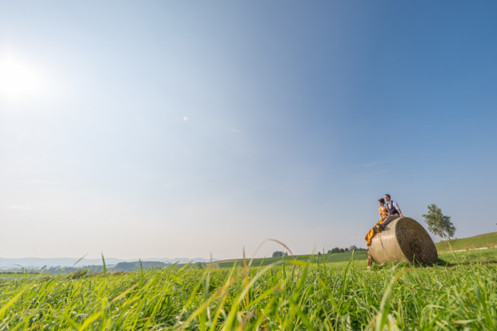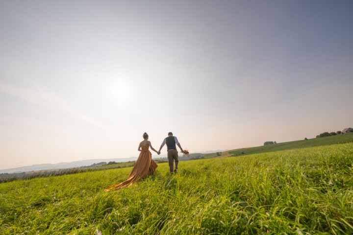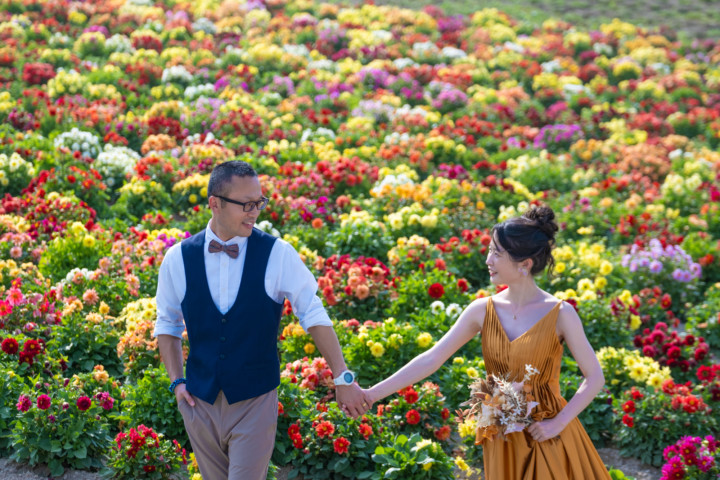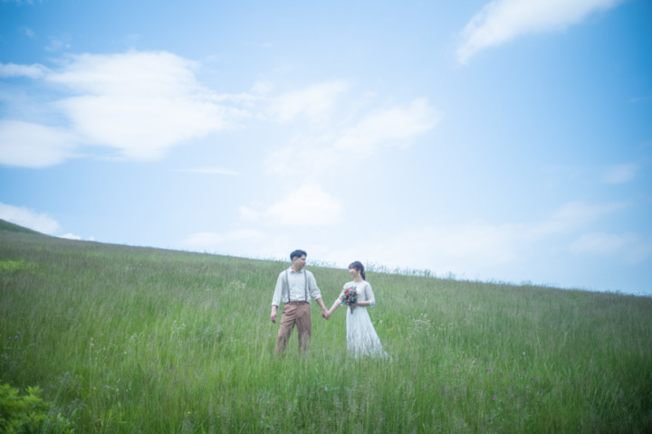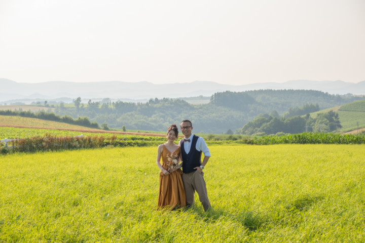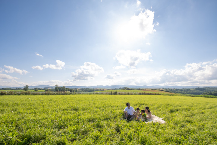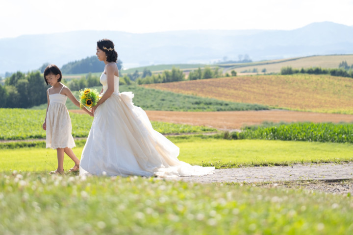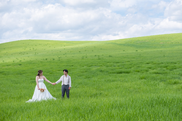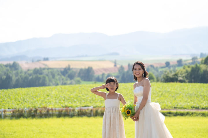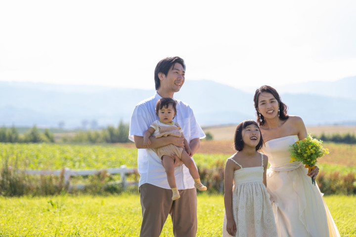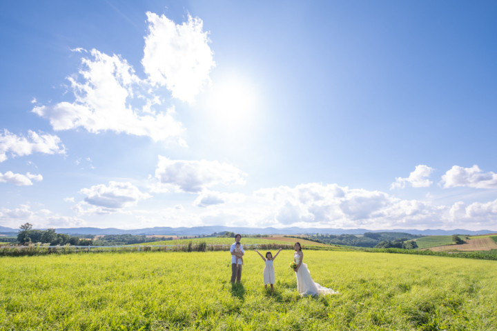 今回の撮影ではファミリーフォトも行い、お二人の写真はもちろんですが広い大地をのびのびと自由に走り回るお子さんの姿は印象的で、まるで映画のワンシーンのようでした。お花畑、丘、草原などたくさんのスポットを巡り自然な笑顔あふれるフォトウエディングとなりました♪