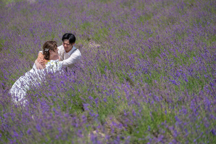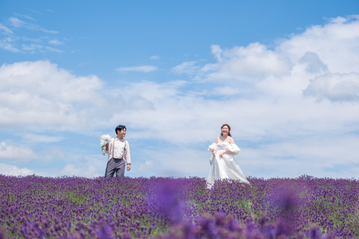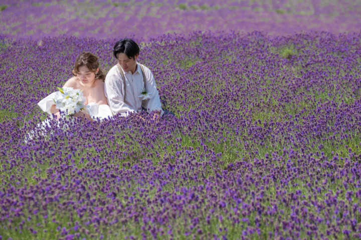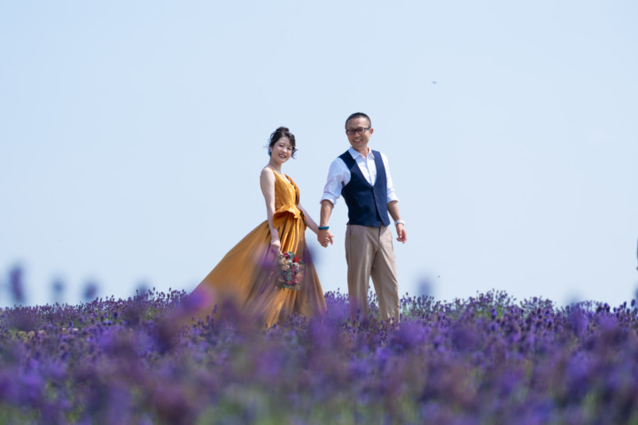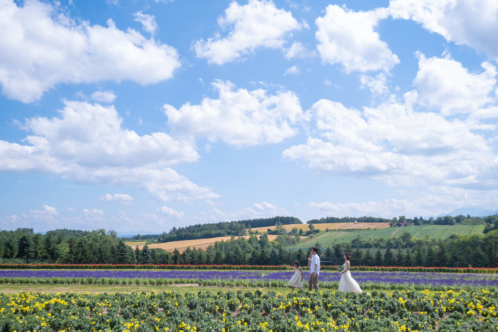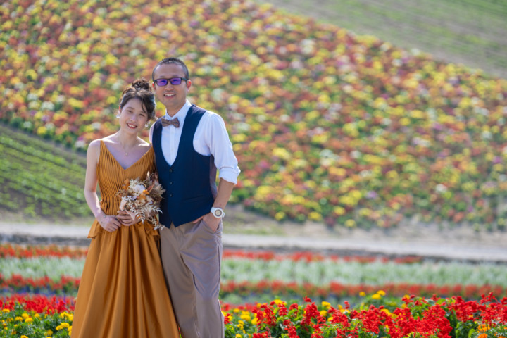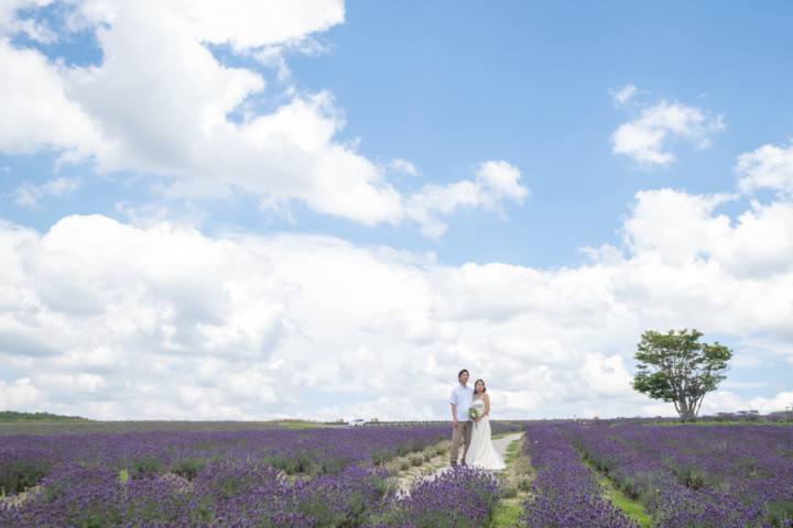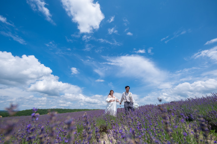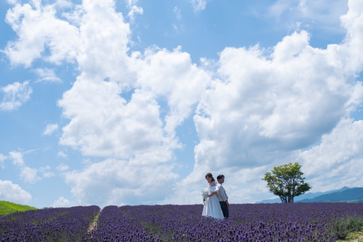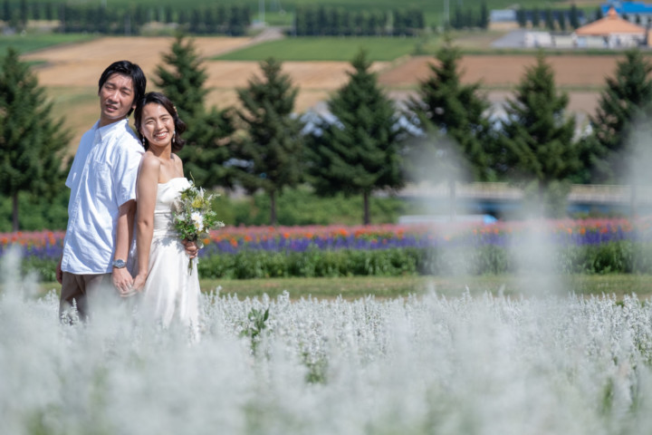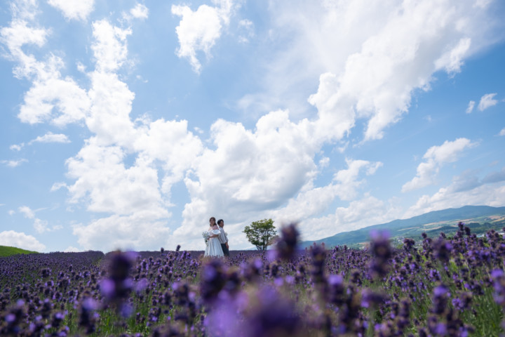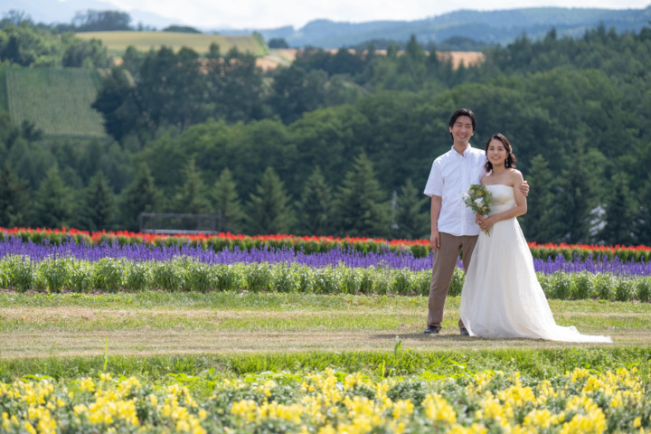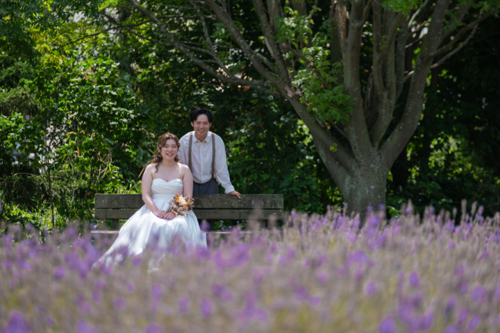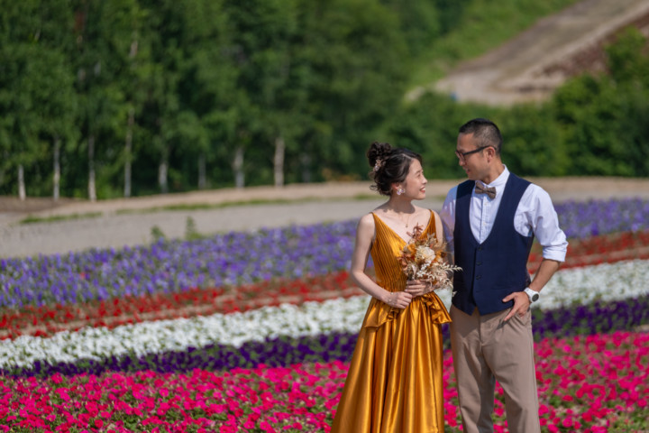 7月の限られた時期にしか見ることのできない一面紫のラベンダー畑は思わず息を呑む絶景で、ラベンダーの中に一歩足を踏み入れると良い香りに包まれながらの爽やかな景色の中での撮影となりました♪その後は色鮮やかで華やかなお花の絨毯が広がる四季彩の丘やフラワーランドにも寄り道。ドレス姿がとても映え、鮮やかな写真を残すことができるスポットでフォトウエディングを楽しみました♪