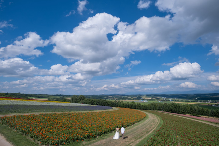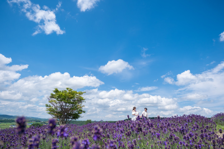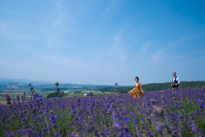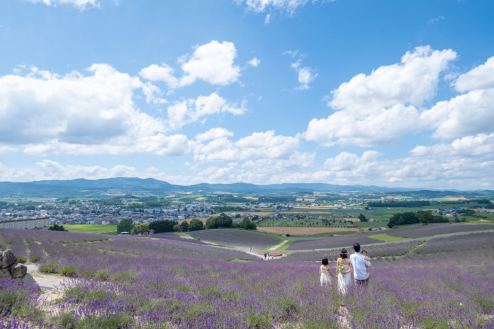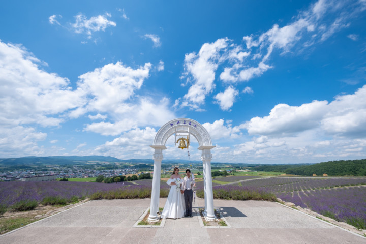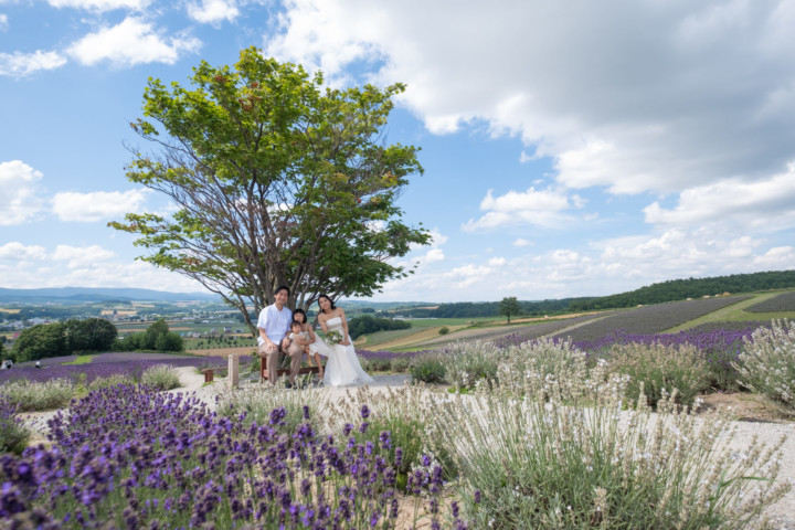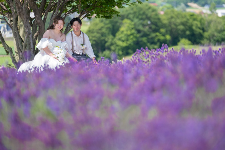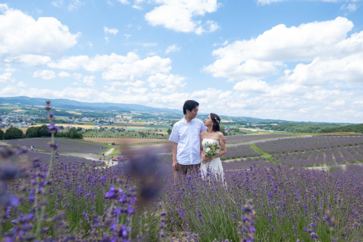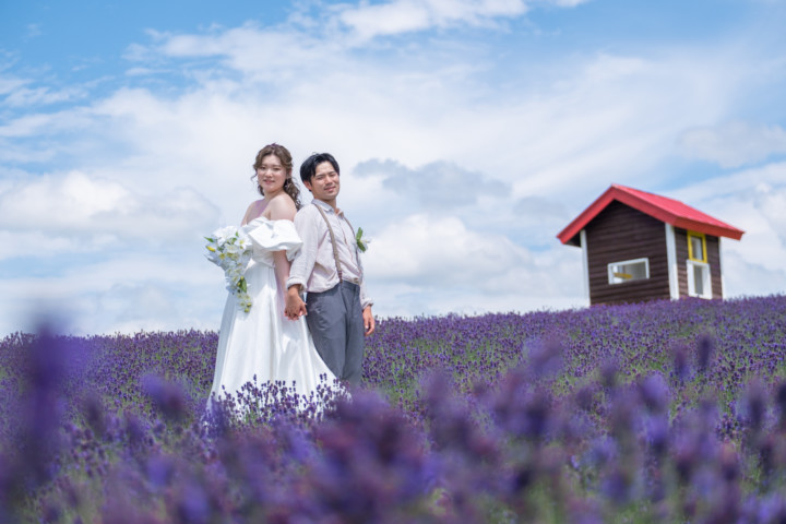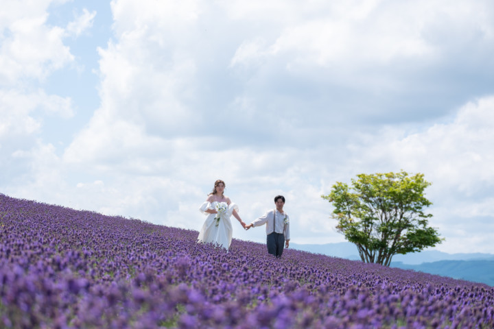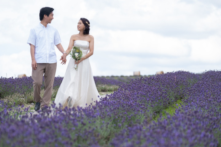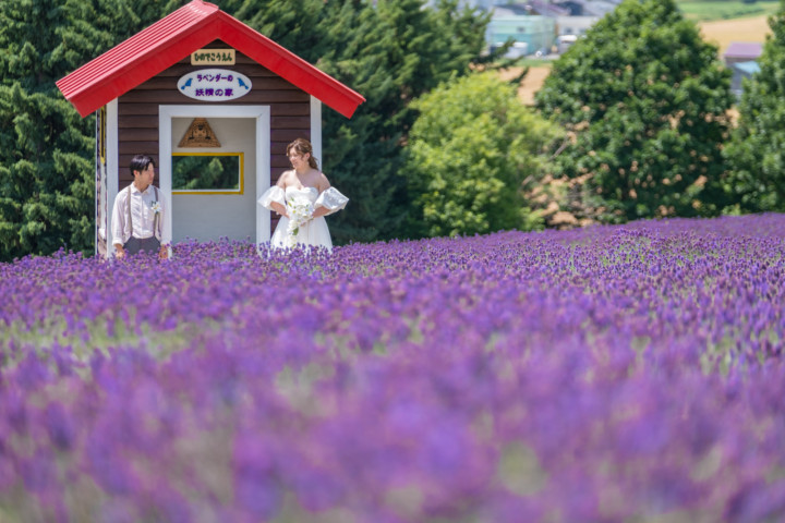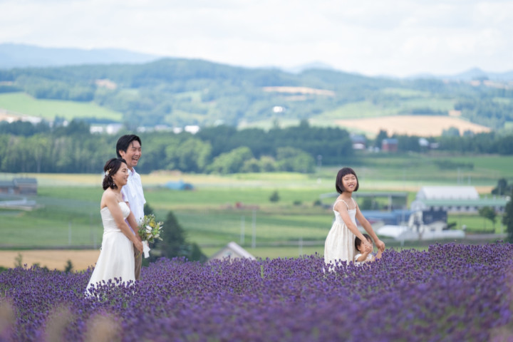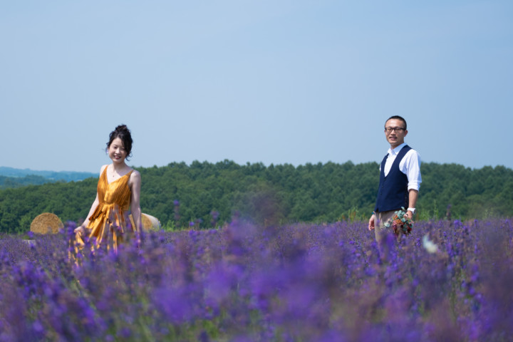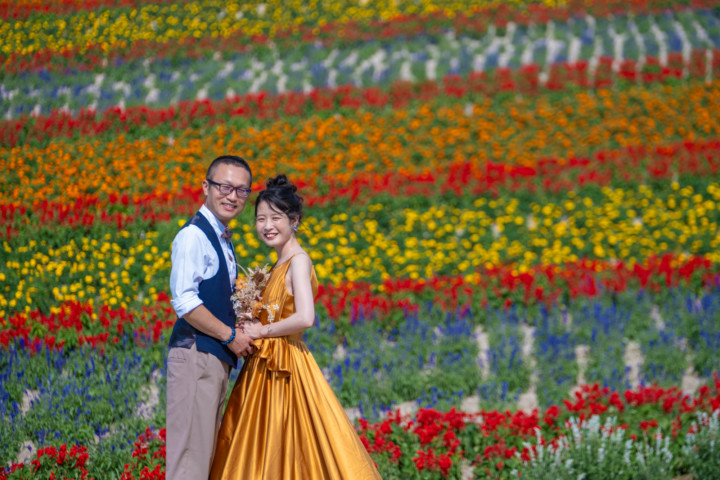 7月の限られた時期にしか見ることのできない一面紫のラベンダー畑は思わず息を呑む絶景で、ラベンダーの中に一歩足を踏み入れると良い香りに包まれながらの爽やかな景色の中での撮影となりました♪その後は色鮮やかで華やかなお花の絨毯が広がる四季彩の丘やフラワーランドにも寄り道。ドレス姿がとても映え、鮮やかな写真を残すことができるスポットでフォトウエディングを楽しみました♪