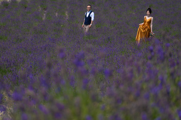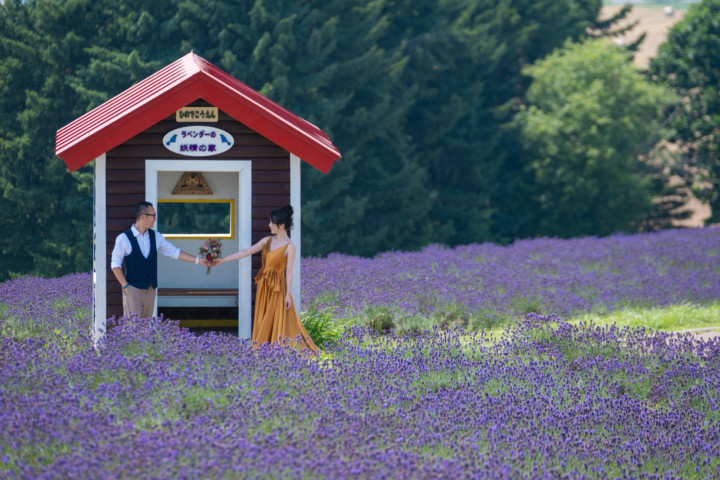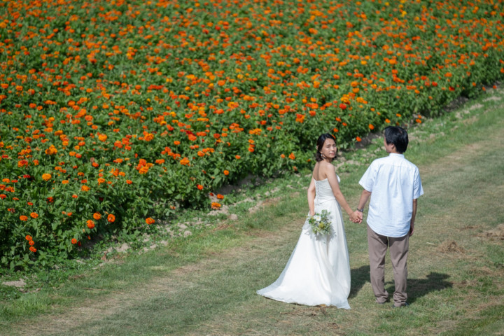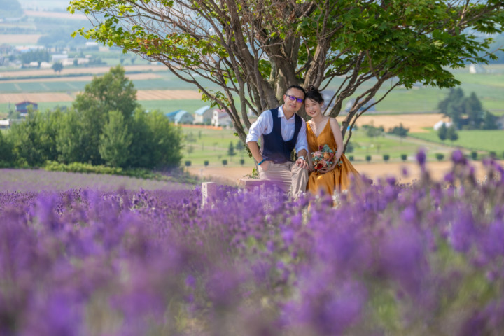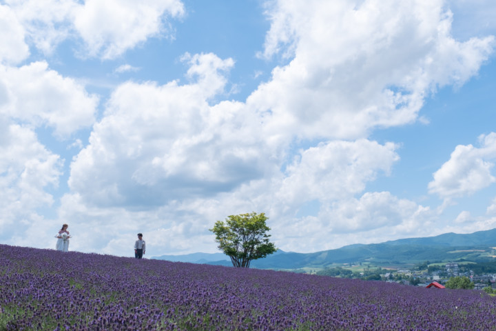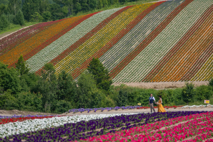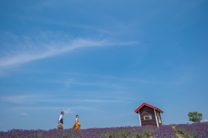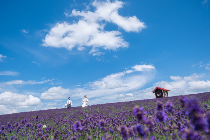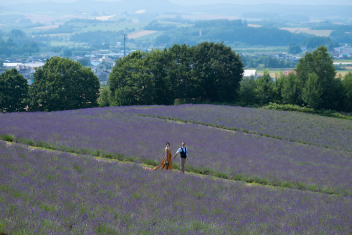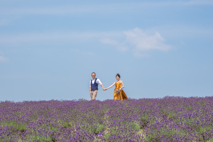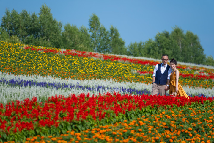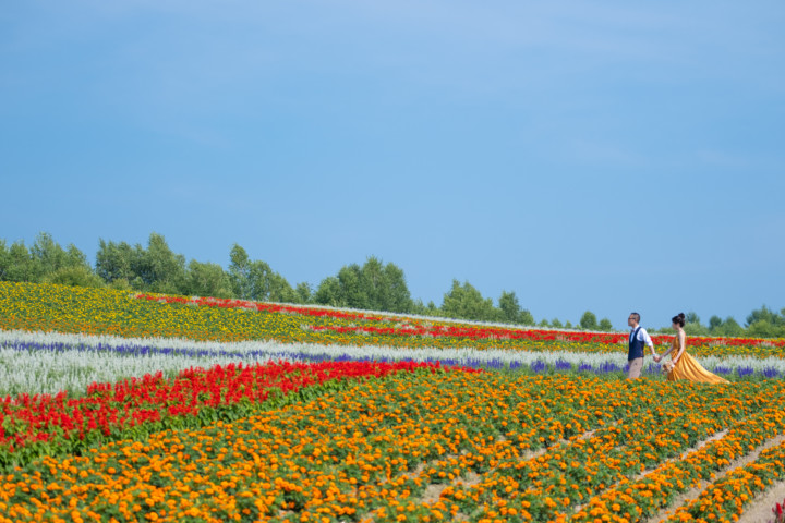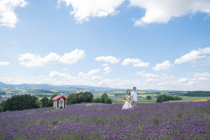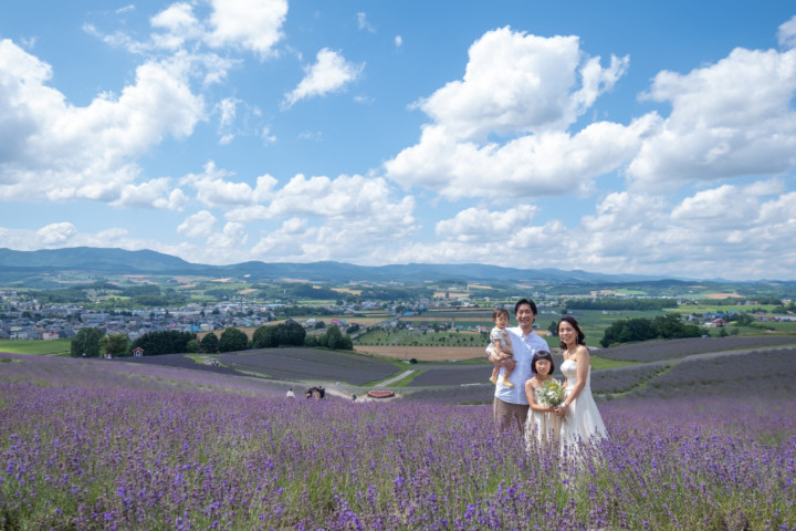 7月の限られた時期にしか見ることのできない一面紫のラベンダー畑は思わず息を呑む絶景で、ラベンダーの中に一歩足を踏み入れると良い香りに包まれながらの爽やかな景色の中での撮影となりました♪その後は色鮮やかで華やかなお花の絨毯が広がる四季彩の丘やフラワーランドにも寄り道。ドレス姿がとても映え、鮮やかな写真を残すことができるスポットでフォトウエディングを楽しみました♪